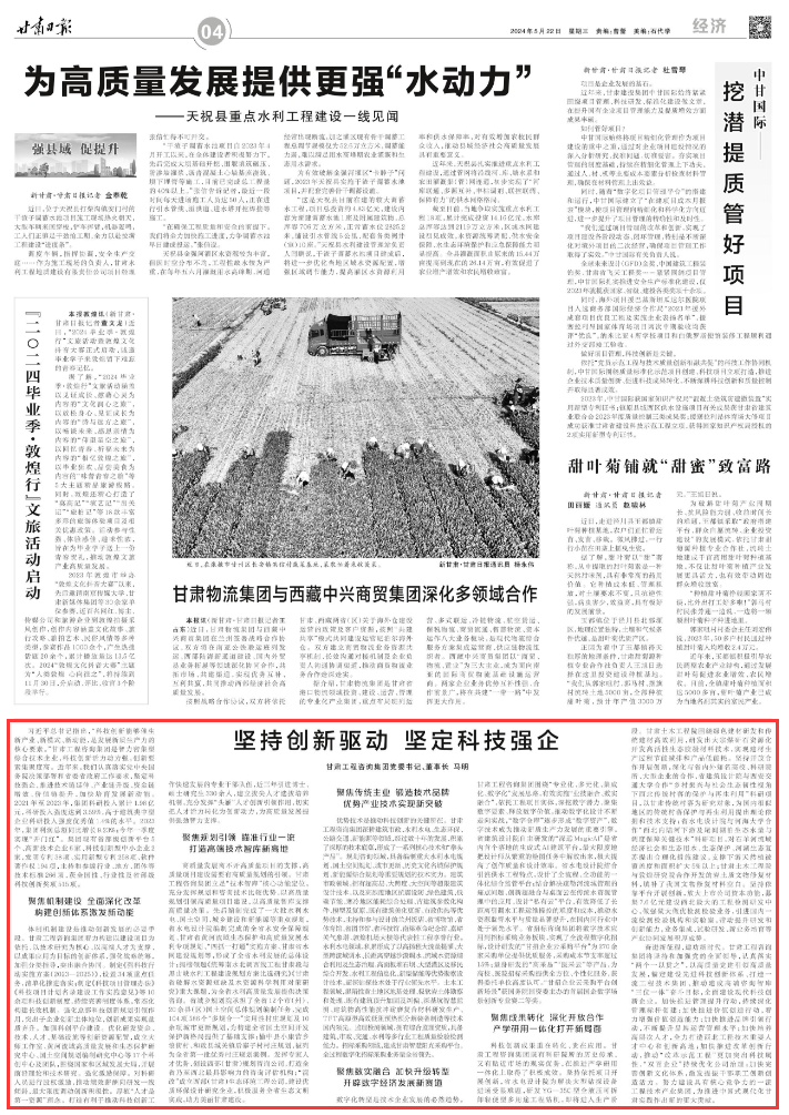 奮進(jìn)新征程,建功新時(shí)代。甘肅工程咨詢集團(tuán)將堅(jiān)持和加強(qiáng)黨的全面領(lǐng)導(dǎo),認(rèn)真落實(shí)“兩個(gè)一以貫之”,以高質(zhì)量黨建引領(lǐng)高質(zhì)量發(fā)展,錨定建設(shè)先進(jìn)科技創(chuàng)新體系、打造一流工程技術(shù)集團(tuán)、推動(dòng)建成高端咨詢智庫(kù)“三位一體”奮斗目標(biāo),全面建設(shè)現(xiàn)代科技創(chuàng)新企業(yè)。加快推進(jìn)管理提升行動(dòng),持續(xù)深化管理標(biāo)桿創(chuàng)建;加快推進(jìn)價(jià)值創(chuàng)造行動(dòng),著力增強(qiáng)價(jià)值創(chuàng)造能力;加快推進(jìn)品牌引領(lǐng)行動(dòng),不斷提升品牌運(yùn)營(yíng)管理水平;加快培養(yǎng)高層次人才,全力打造西北工程技術(shù)重要人才中心和創(chuàng)新高地;加快推進(jìn)改革創(chuàng)新行動(dòng),推動(dòng)“改革示范工程”更加突出科技屬性、“雙百企業(yè)”持續(xù)優(yōu)化公司治理;加快完善創(chuàng)新文化體系,激發(fā)提振干部職工創(chuàng)新創(chuàng)造活力。努力建設(shè)具有核心競(jìng)爭(zhēng)力的一流工程技術(shù)產(chǎn)業(yè)集團(tuán),為推進(jìn)中國(guó)式現(xiàn)代化甘肅實(shí)踐作出新的更大貢獻(xiàn)。