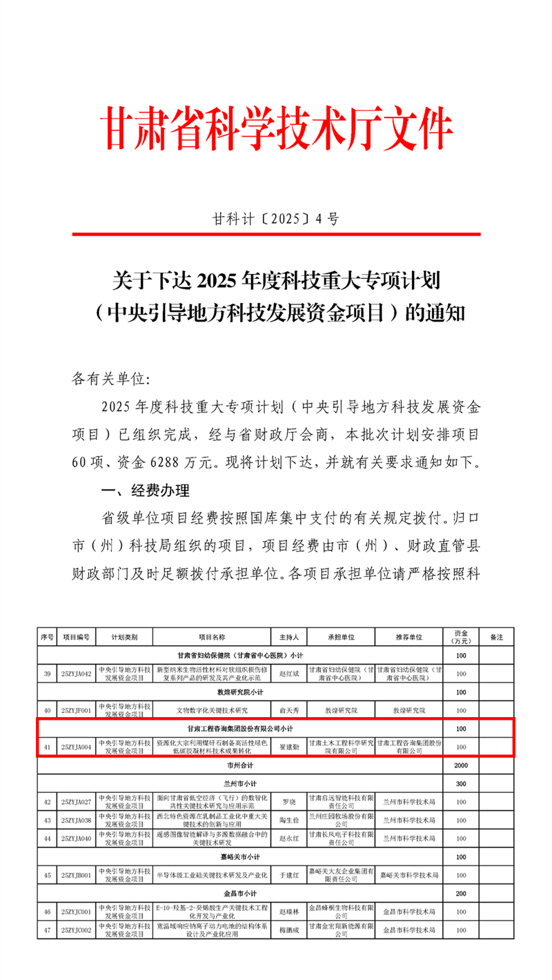 近日,甘肅省科技廳公布了2025年度科技重大專項計劃(中央引導地方科技發(fā)展資金項目)立項名單,甘肅工程咨詢集團土木工程院主持申報的“資源化大宗利用煤矸石制備高活性綠色低碳膠凝材料技術成果轉化”項目成功立項。