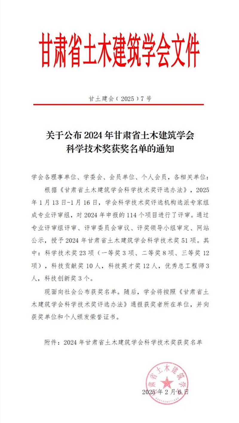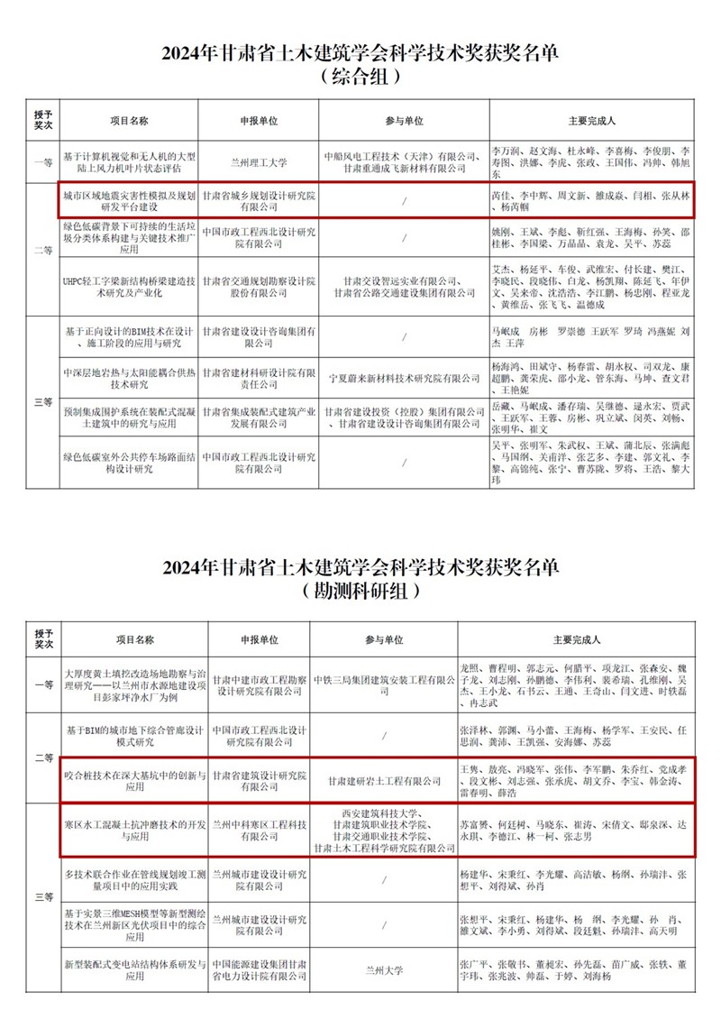 近日,2024年甘肅省土木建筑學會科學技術(shù)獎獲獎結(jié)果公布,甘肅工程咨詢集團斬獲多項榮譽。其中,省建筑設(shè)計院申報的《咬合樁技術(shù)在深大基坑中的創(chuàng)新與應(yīng)用》項目榮獲“科學技術(shù)獎(勘測科研組)二等獎”,省城鄉(xiāng)規(guī)劃院申報的《城市區(qū)域地震災(zāi)害模擬及規(guī)劃研發(fā)平臺建設(shè)》項目榮獲“科學技術(shù)獎(綜合組)二等獎”,土木工程院參與的《寒區(qū)水工混凝土抗沖磨技術(shù)的開發(fā)與應(yīng)用》項目榮獲“科學技術(shù)獎(勘測科研組)三等獎”。省建筑設(shè)計院、省城鄉(xiāng)規(guī)劃院4人分別榮獲“科技貢獻獎”“科技英才獎”“科技貢獻獎”“優(yōu)秀總工程師獎”等榮譽稱號。