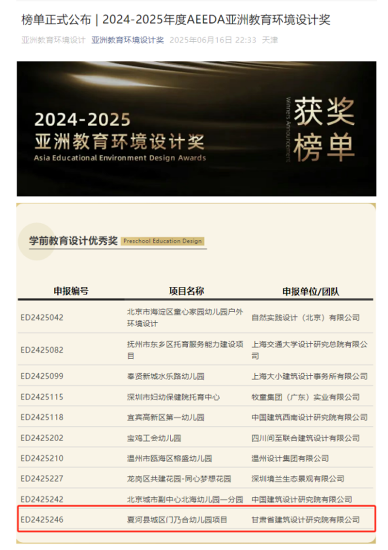 近日,備受矚目的2024-2025年度AEEDA亞洲教育環(huán)境設(shè)計(jì)獎(jiǎng)(Asia Educational Environment Design Awards)獲獎(jiǎng)名單正式揭曉。由甘肅工程咨詢(xún)集團(tuán)旗下省建筑設(shè)計(jì)院設(shè)計(jì)的夏河縣城區(qū)門(mén)乃合幼兒園項(xiàng)目,從百余件參賽作品中脫穎而出,榮膺學(xué)前教育設(shè)計(jì)領(lǐng)域優(yōu)秀獎(jiǎng),為甘肅建筑設(shè)計(jì)行業(yè)贏得了國(guó)際聲譽(yù)。