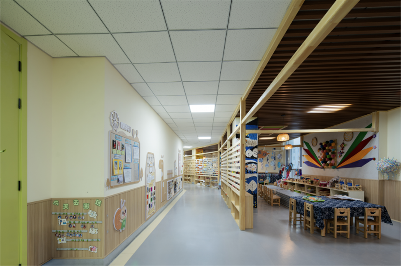設(shè)計(jì)團(tuán)隊(duì)秉承“文化根系·生態(tài)課堂”的核心理念,實(shí)現(xiàn)了三大創(chuàng)新突破:文化傳承創(chuàng)新,巧妙解構(gòu)傳統(tǒng)藏式建筑語(yǔ)匯,以象征性的“煨桑臺(tái)”形態(tài)塑造入口空間,并運(yùn)用夯土墻、木質(zhì)格柵等本土材料與工藝,喚醒地域文化記憶。生態(tài)教育融合,充分利用場(chǎng)地自然高差,構(gòu)建多層級(jí)生態(tài)活動(dòng)圈。設(shè)置屋頂農(nóng)場(chǎng)、戲水溪谷、觀星臺(tái)等多元互動(dòng)空間,鋪設(shè)出一條“從土壤到星空”的自然認(rèn)知與探索路徑。兒童友好設(shè)計(jì),深度契合3-6歲兒童行為特征,引入模塊化家具系統(tǒng),并融入光影劇場(chǎng)、交互藝術(shù)墻等智慧化設(shè)施,充分激發(fā)幼兒的好奇心、探索精神與創(chuàng)造力。