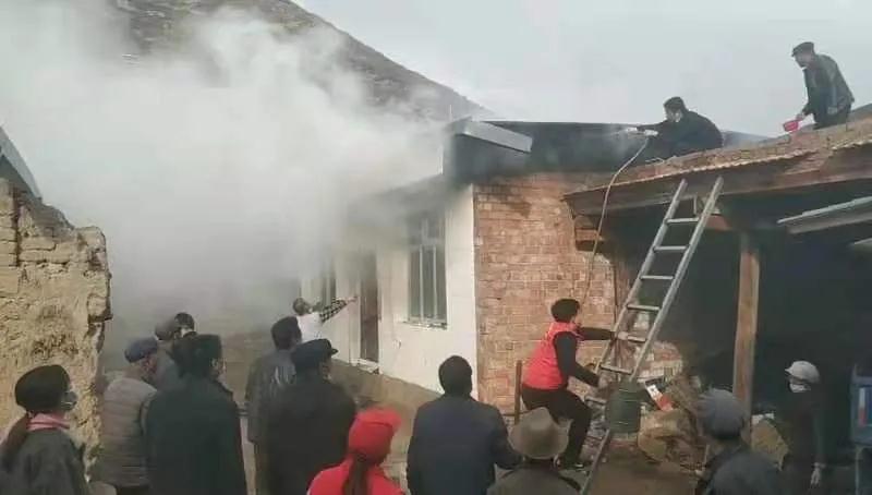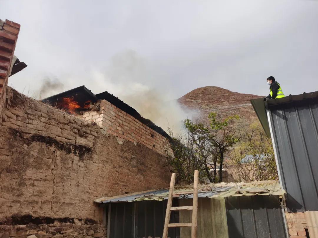 10月30日下午3點(diǎn),交通監(jiān)理公司負(fù)責(zé)幫扶的臨潭縣洮濱鎮(zhèn)馬旦溝村一戶村民家中突然冒出滾滾濃煙,火光在濃煙中忽隱忽現(xiàn)。著火是一座磚木結(jié)構(gòu)彩鋼屋頂?shù)男路浚饛奈蓓敓?,越燒越旺。著火的房屋旁邊堆放著多年的老柴火,干燥異常,一絲火星就能點(diǎn)燃,而與著火點(diǎn)緊鄰著的就是布局緊密的鄉(xiāng)親們的房屋,再往外圍則緊接著山林,如果火勢(shì)蔓延,后果將不堪設(shè)想。