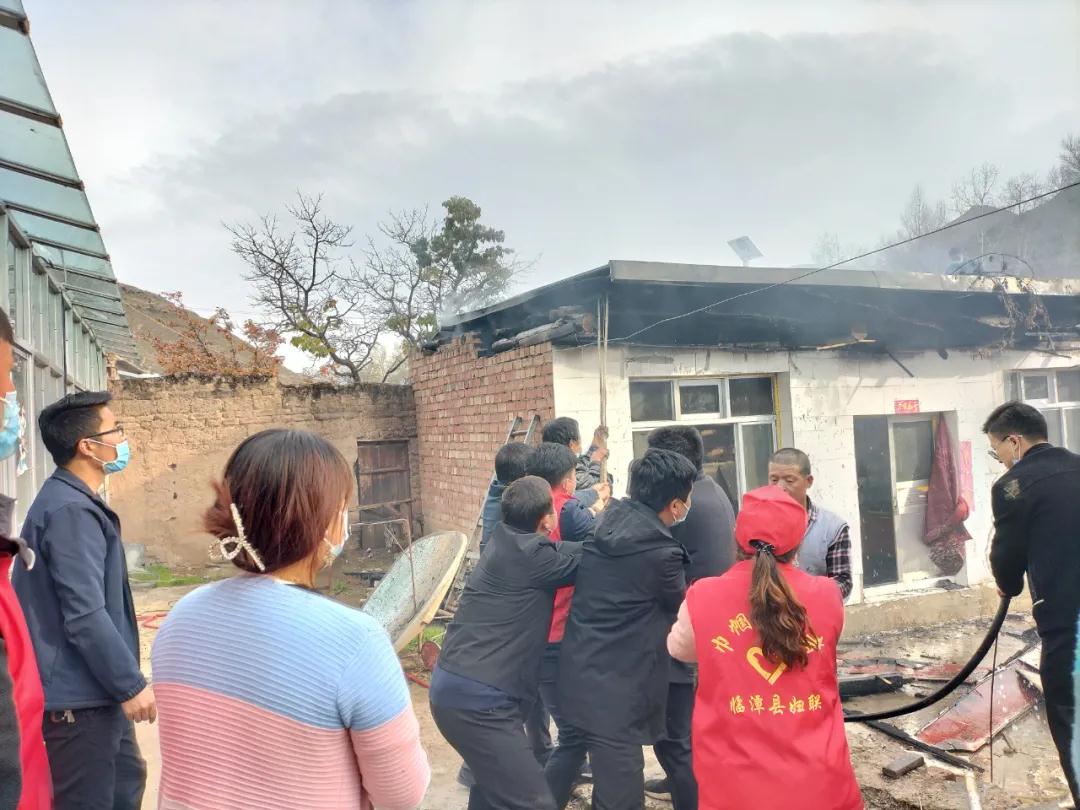 聽(tīng)到村民們的呼救聲,正在村口疫情防控監(jiān)測(cè)點(diǎn)值守的幫扶工作隊(duì)隊(duì)員、包村干部與鎮(zhèn)領(lǐng)導(dǎo)、村“兩委”干部及志愿者一起,第一時(shí)間沖向了火災(zāi)現(xiàn)場(chǎng),實(shí)施開(kāi)展撲救工作?,F(xiàn)場(chǎng)火勢(shì)兇猛,盡管眾人一起用水傾澆,卻仍未阻止火勢(shì)蔓延。瞬間,屋頂?shù)臋M梁也燒著了,發(fā)出噼啪的響聲,房頂隱約在搖晃,可大家依然奮不顧身地救火,甚至有人沖上了危險(xiǎn)的屋頂。