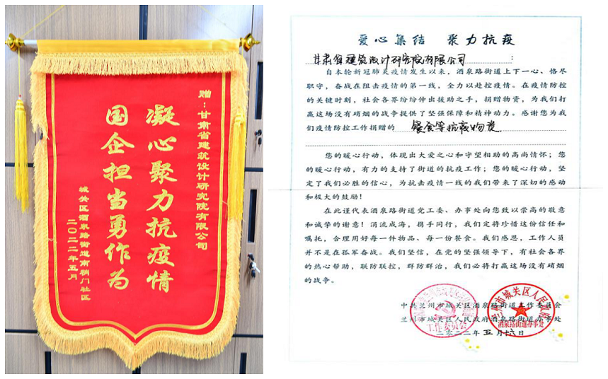 5月16日,甘肅省建筑設計研究院有限公司收到了來自蘭州市城關(guān)區(qū)酒泉路街道送來的感謝錦旗,錦旗上書寫著“凝心聚力抗疫情 國企擔當勇作為”。建筑設計院黨委書記李向軍、總經(jīng)理曹慶、紀委書記丁永升及黨群工作部相關(guān)負責人接待來訪。